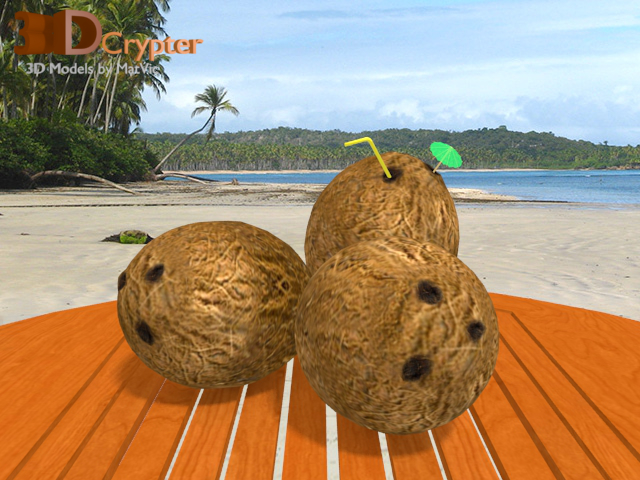 Modelli 3D di noci di cocco con cannuccia e ombrellino da cocktail, appoggiate su un tavolo di legno circolare. I modelli sono stati realizzati in Blender v2.67b, completi di materiali e texture.
